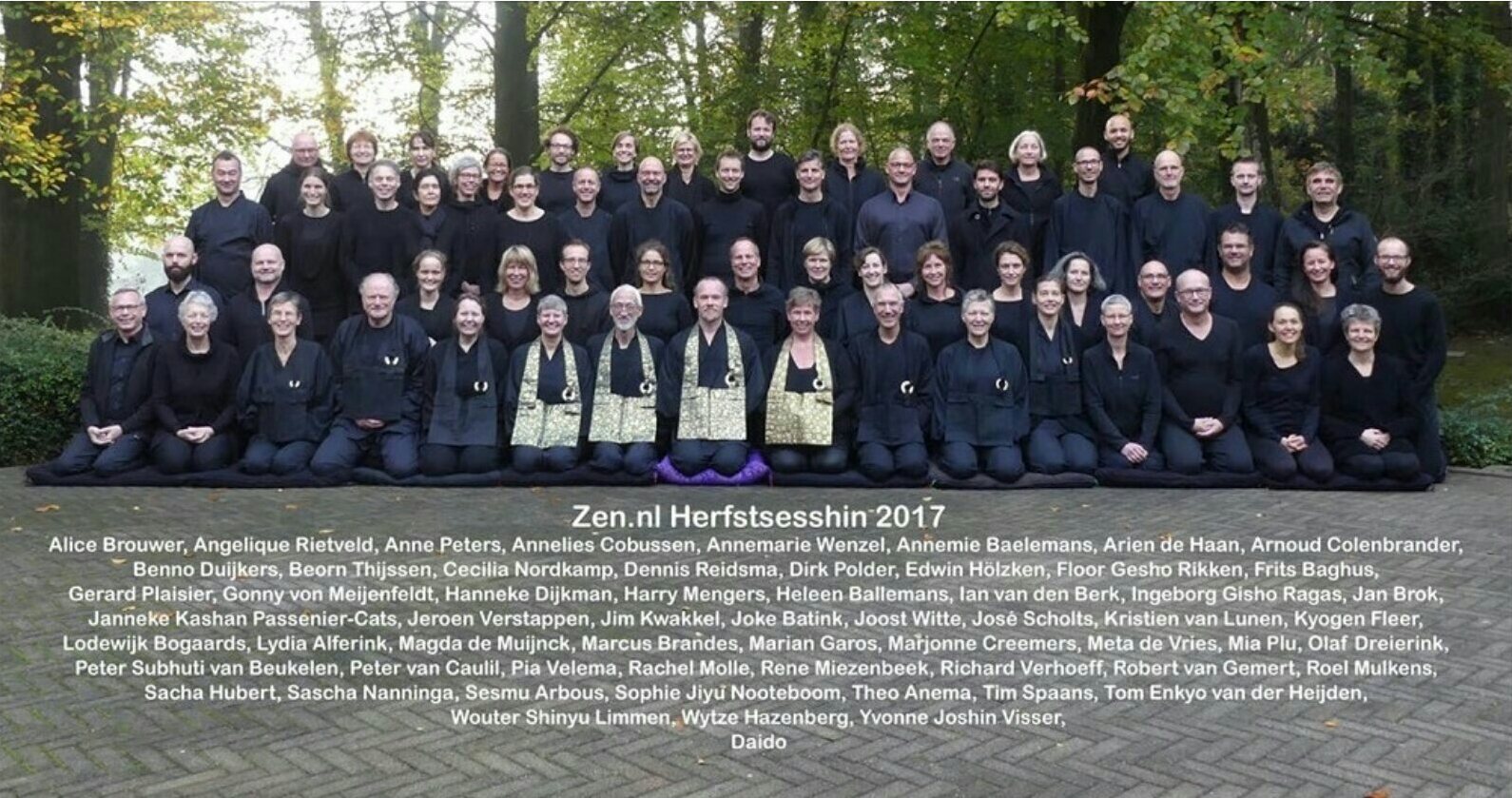 Na deze verhalen hebben we nog drie blokjes gemediteerd. Het eerste van de drie heb ik nog in lotushouding gezeten, maar dat begon op een gegeven moment toch zijn tol te eisen. Zelf bewust de keuze maken om af te zien is goed, maar je moet jezelf ook niet forceren. Tijdens de laatst twee blokjes kwam iedereen aan de beurt voor een persoonlijk onderhoud. De extra beweging kwam mij goed uit, want de slaap begon mij nu ook al parten te spelen. Toen Dymphie terugkwam van dokusan zette ze de A-oefening in en iedereen deed mee. Het voelde als een volwaardige sesshin en ik was blij toen Dymphie de laatste keer de schaal liet galmen. We waren stipt op tijd klaar; nu nog even met zijn allen op de foto. Het wachten was nog even op Etiënne die de leerlingen van de introductiecursus buitenliet. Met de camera op het statief en de zelfontspanner op driemaal hebben we verschillende pogingen gedaan om een perfecte foto te maken, ik ben benieuwd naar het resultaat. Helaas moest ik na afloop snel naar huis. Graag was ik meegegaan naar Coffee & Cream aan de overkant, maar om 13:15 uur kon ik de bezorger van mijn chauffeurspas thuis verwachten en die pas moest ik persoonlijk in ontvangst nemen. Volgende keer beter, het zal vast gezellig geweest zijn. Voor we afscheid namen hebben we eerst de restanten van het ontbijt opgemaakt en kregen we allemaal nog een knuffel en een bloem.