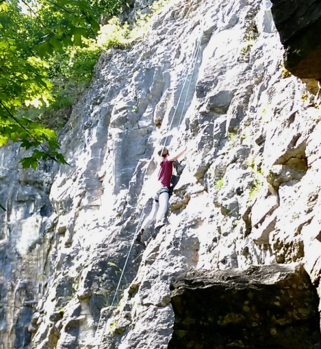 Afgelopen week was het dan zover. Patrick had laten weten dat er waarschijnlijk nog meer mensen mee zouden gaan, als ik er tenminste geen bezwaar tegen had. Hoe meer zielen hoe meer vreugd vind ik, dus geen probleem. Toen we zaterdag net na de middag in Rouvres sur Aube arriveerden werden we daar weer hartelijk welkom geheten, en er was een ander stel die daar tot en met tweede Pinksterdag zouden blijven. Die avond zou er nog iemand komen die na het Pinksterweekend met ons op een Roadtrip zuidwaarts zou gaan. De eerste dag konden we meteen aan de slag. Op iets meer dan dertig kilometer afstand is een klimgebied waar je verschillende routes van allerlei gradaties kunt klimmen. Het was voor mij en mijn zoon de eerste ervaring buiten de klimhal en het was best spannend. Helaas had ik een flinke kou te pakken en had ik weinig energie voor mijn gevoel, maar mijn zoon ging als een speer. Het zekeren lukte me wel, maar klimmen zat er niet in. Zekeren is een speciale techniek waarbij je met bepaalde materialen het touw kunt begeleiden waar de klimmer aan vast zit zodat hij niet zomaar te pletter valt. Ondertussen goed opletten, luisteren naar de tips van de meer ervaren klimmers Patrick, Jean en Coen, en natuurlijk goed het touw vasthouden. De volgende dag voelde ik me beter. Gewapend met de kennis die ik de vorige dag had opgedaan was ik zo boven, een mooie ervaring.